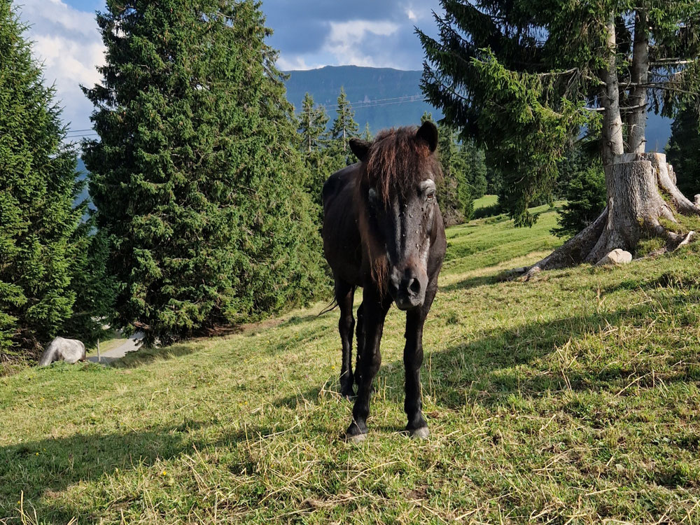 Unsere Barhuf-Herde lebt im Offenstall mit Zugang zum Trail und Allwetterplatz. Als Einstreu stehen Naturbett-Liegeflächen zur Verfügung. Sechs Mal täglich erhalten Sie mittels Futterautomaten von unserem eigenproduzierten Bergheu, das vorab mit einer Heurüstmaschine aufbereitet und bedampft wird. Diejenigen, die mehr Futter benötigen, erhalten über Nacht in einem separaten Bereich Heu ad libitum. Den Sommer verbringen die Pferde auf der Alp. Aufgrund der steilen Weiden, welche vor und nach der Alpzeit benutzt werden, nehmen wir nur Kleinpferde/Ponys in die Herde auf. Durchschnittlicher Monatspensionspreis für Alterspferd mit bedampftem Heu und Alpung CHF 215-475 (nach Stockmass/Gewicht bis 149cm/500kg).
