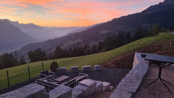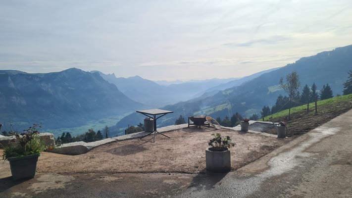 Die beiden Stellplätze befinden sich einzeln entlang der Schwendiwiesenstrasse auf Asphalt/Beton/Kies zwischen dem Wohnhaus und der Scheune mit traumhafter Aussicht in die Berge und das Sarganserland.